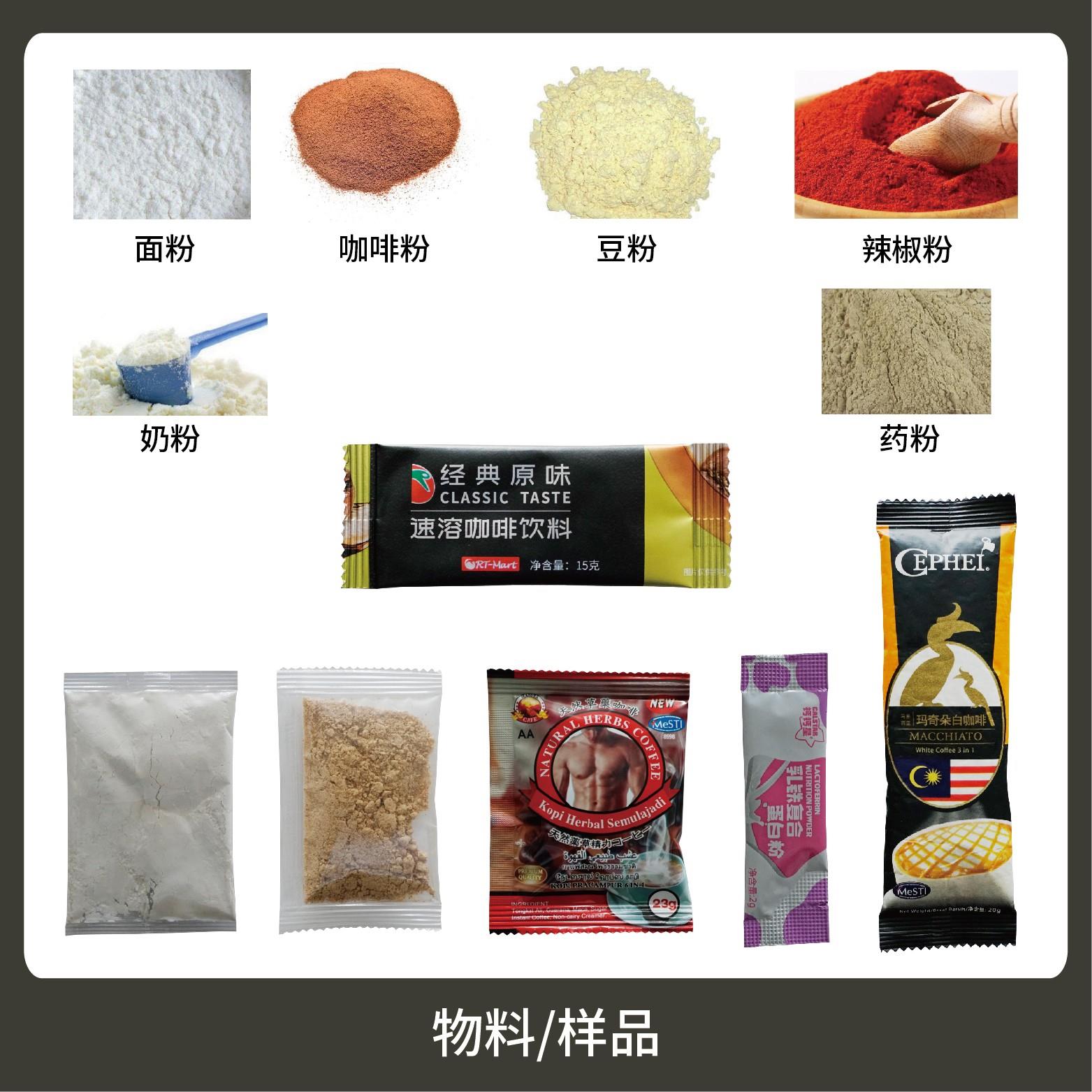 適用于食品、醫(yī)藥、化工、化妝品行業(yè)中粉末物品的計量包裝,如:豆?jié){、奶粉、咖啡粉等。